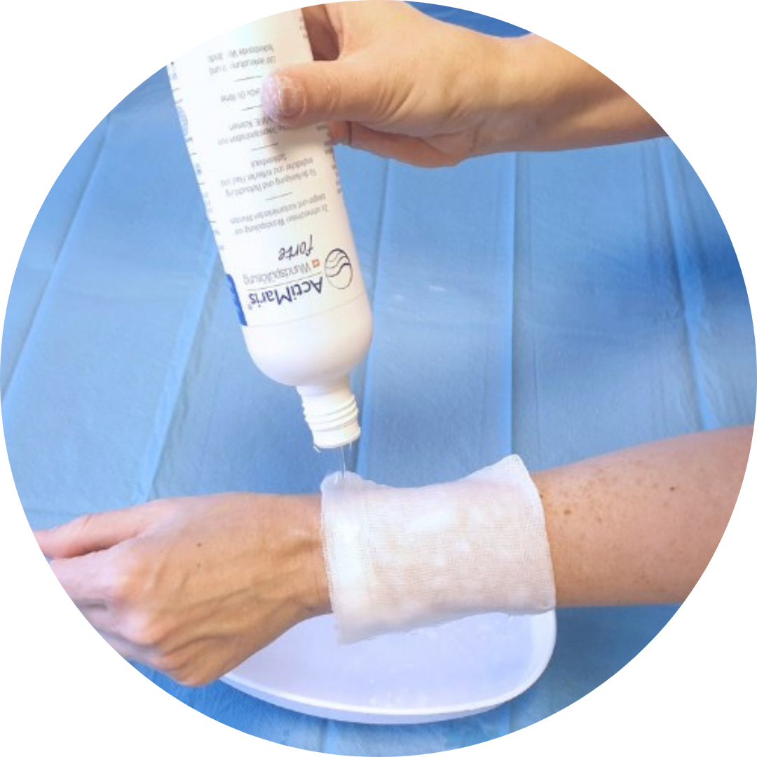 2. Postižené místo vyčistíme roztokem ActiMaris® Sensitiv nebo roztokem důkladně navlhčíme gázu (čtverec), přiložíme na postižené místo a necháme 15 – 20 min. působit.